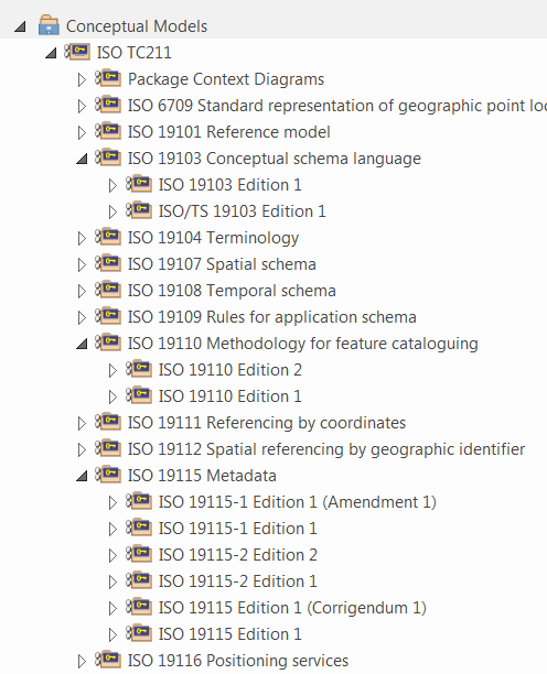 메인 패키지 "ISO TC211" 속에는 각각의 표준이 서브 패키지로 들어 있다. 이들 서브 패키지에는 부(part)별, 버전(edition)별로 패키지가 구성되어 있다.