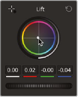 - 그다음 Lift를 사용해 어두운 쪽 조정. 그림자에 파란색이 많은 상태. Lift의 Color wheel 중심점을 끌어서 파란색이 멀어지는 방향으로.
