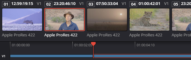 - 썸네일 2번을 클릭하면 경계가 오렌지 색으로 바뀌고 플레이헤드가 2번 클립 맨 앞으로 이동