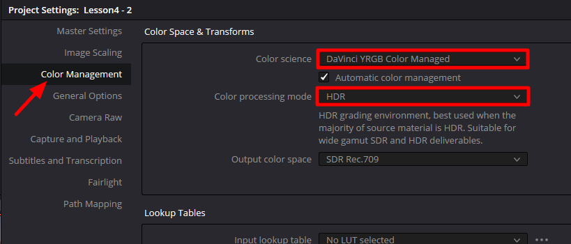 - Color Management 카테고리에서 Color science 드롭다운. DaVinch YGRB Color Managed를 선택. Color processing mode에서 HDR 선택(타임라인의 클립에는 SDR 뿐 아니라 HDR 자료도 있기 때문). 출력 색 공간은 HD 방송에서 표준인 Rec.709.
