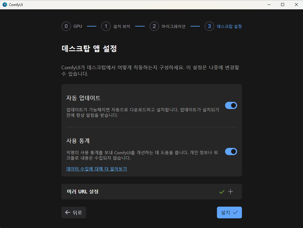 저는 설치하다가 위쪽 "기존 설치에서 마이그레이션"에서 오류가 발생해서 기존에 설치했던 모델을 함께 사용하지 못하게 되었습니다. 그리고 출력 파일 위치도 다른 곳으로 바꿀 수 없고요. 그래서 심볼릭 링크를 만들어 해결해야 했습니다.