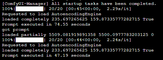 실행시간은 ComfyUI 로그를 사용해 확인했습니다. 아래는 ComfyUI데스크탑 버전의 실행화면인데, 처음 실행때는 74.55초, 두번째 실행될 때는 47.19초 정도 소요되었습니다.