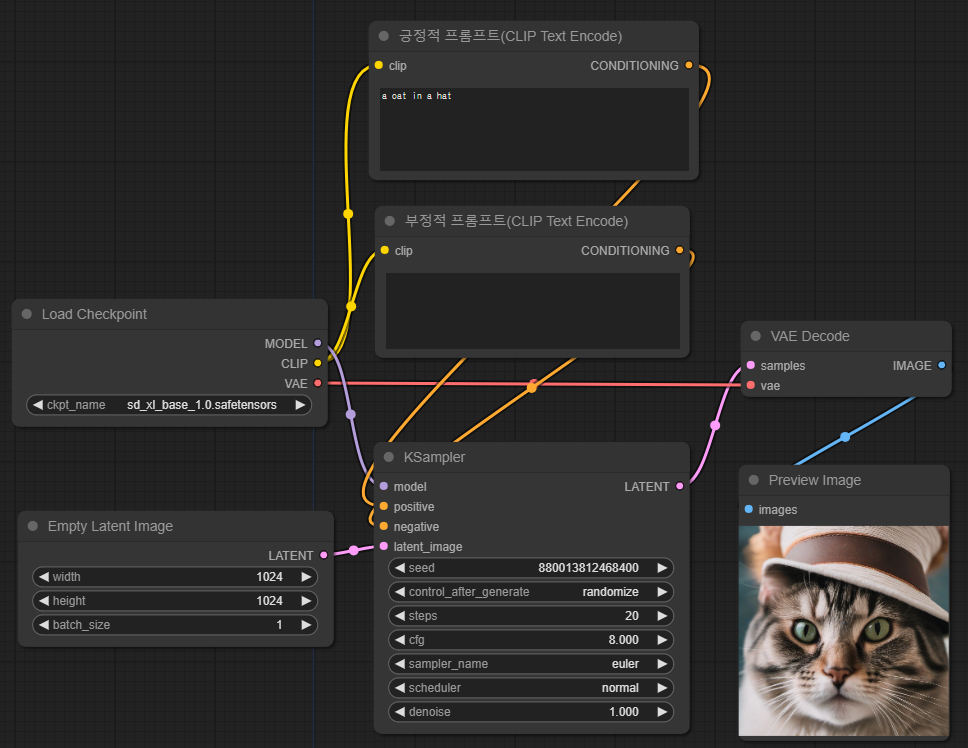 스테이블 디퓨전을 사용하는 분들중 대부분은 AUTOMATIC1111 웹UI를 사용합니다. 그만큼 대중적이기도 하고 사용하기 쉽기 때문입니다. 하지만, 사용할 수 있는 방식이 정해져 있다보니 어떤 절차를 거쳐 이미지가 생성하는지 알기도 힘들고, 이 절차를 마음대로 수정하기도 쉽지 않습니다. ComfyUI는 이러한 AUTOMATIC1111의 단점을 극복할 수 있는 웹UI입니다. Stable Diffusion 모델의 워크플로를 좀 더 자세히 알 수 있고 세밀하게 조정할 수 있습니다. 대신 사용하기가 쉽지는 않죠. 이 글에서는 이전 글에 이어 빈 ComfyUI 캔버스로부터 시작해서 SDXL 모델을 사용해서 이미지를 생성하기 까지 한 단계씩 워크플로를 만들어가는 과정을 설명합니다. 이 글은 아래와 같이 구성되어 ..
