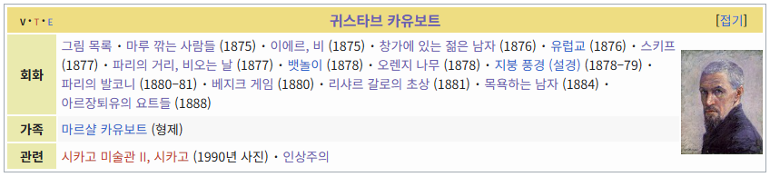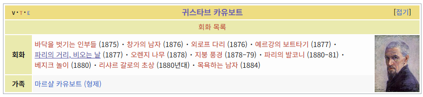 아래는 제가 정리하기 전이고요. 보시면 작품에 대해서는 모두 번역을 완료했고, 이중 《이에르, 비》와 《아르장퇴유의 요트들》는 영어 Template:Gustave Caillebotte에는 존재하지 않아 제가 프랑스어를 기준으로 추가했습니다.