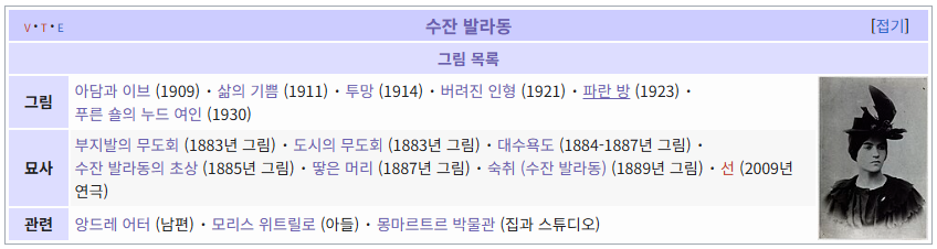 수잔 발라동의 작품을 모두 정리했습니다. 정리하는 기준은 간단히 틀:수잔 발라동에 있는 모든 영어 위키피디아 문서를 번역하고, 여기에 포함되지 않지만 언어링크 수가 6이상인 작품들을 추가하는 방식입니다. 그런데 이번에는 추가할 작품이 전혀 없더군요. 그래서 어렵지 않게 정리를 끝낼 수 있었습니다.