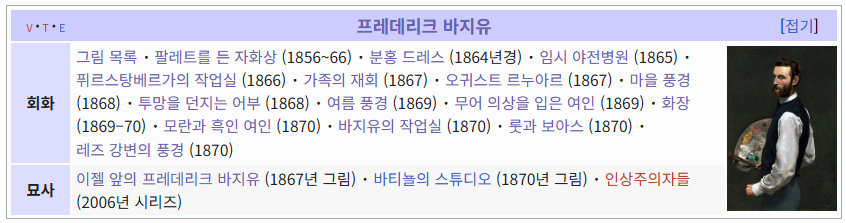 며칠전 프레데리크 바지유에 관한 글들을 정리했습니다. 아래가 그 결과입니다. 틀:프레데리크 바지유를 눌러보시면 직접 확인하실 수 있습니다. 여기에 들어 있는 작품은 위키백과 번역 기준에 따라 선정했습니다. 간단히 말씀드려 영문의 Template:Frédéric Bazille 에 포함된 문서를 모두 번역하고 미진한 부분은 프랑스어 페이지 등을 찾아서 보완한 겁니다. 프레데리크 바지유의 경우엔 3개의 문서를 추가했네요.