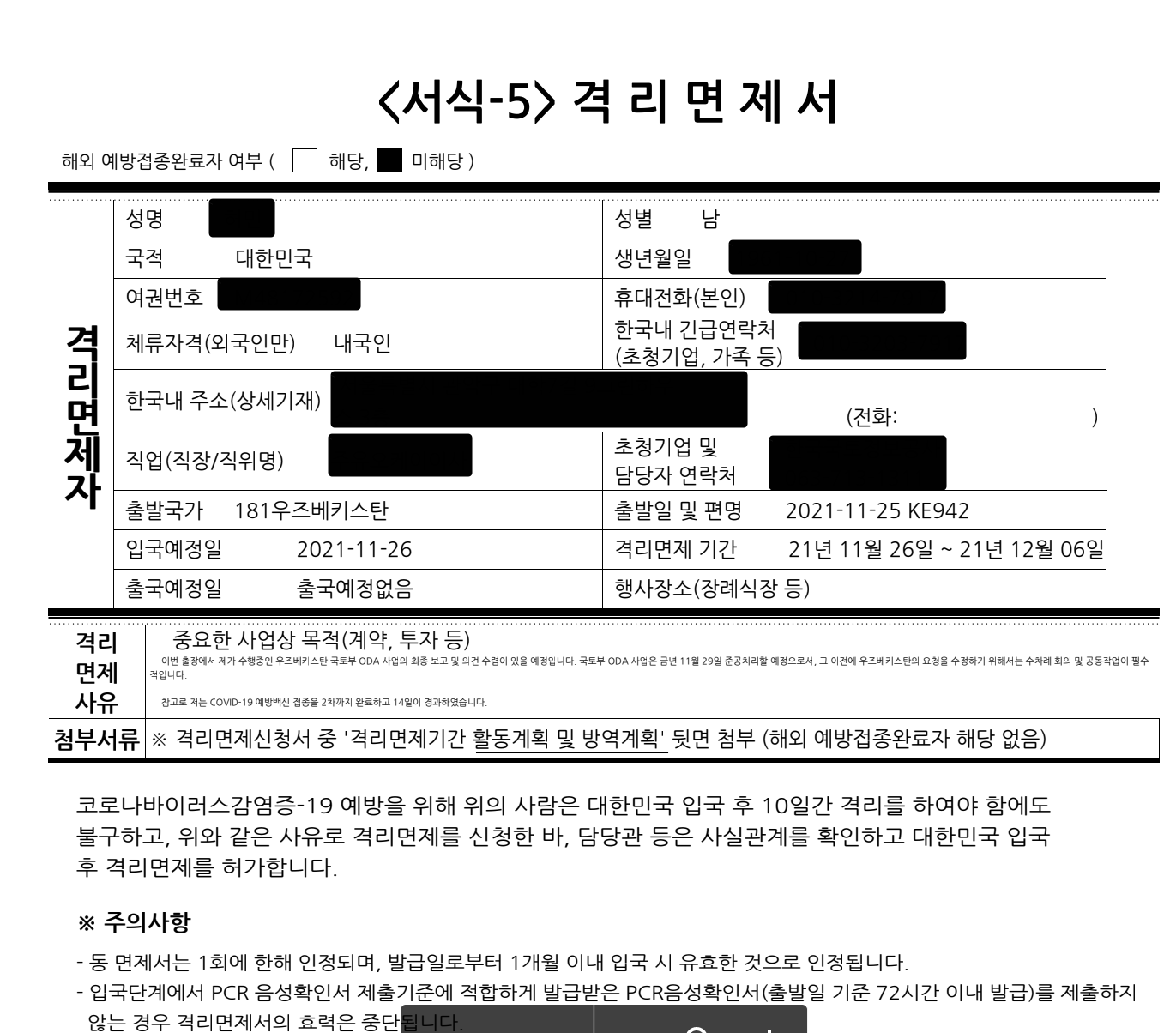 이번 세번쨰 출장은 11월 중순에 출발해 오늘 아침에 도착한 일주일간의 일정이었습니다. 그런데, 백신 접종률이 70%를 넘어가 방역조치가 완화되면서 다시 자가격리면제 신청을 헀고, 이번에는 신청이 받아들여졌습니다. 아래가 격리면제서입니다. 귀국하기 2-3일 전 우즈베키스탄 대사 명의로 자가격리면제서를 받아서 편한 마음으로 비행기를 탈 수 있었죠. 비행기를 내리자마자 전철을 타고 집에 가야겠다... 계속 방역택시만 탔으니, 이번에는 대중교통으로 귀가해야지 하고 다짐했었습니다.