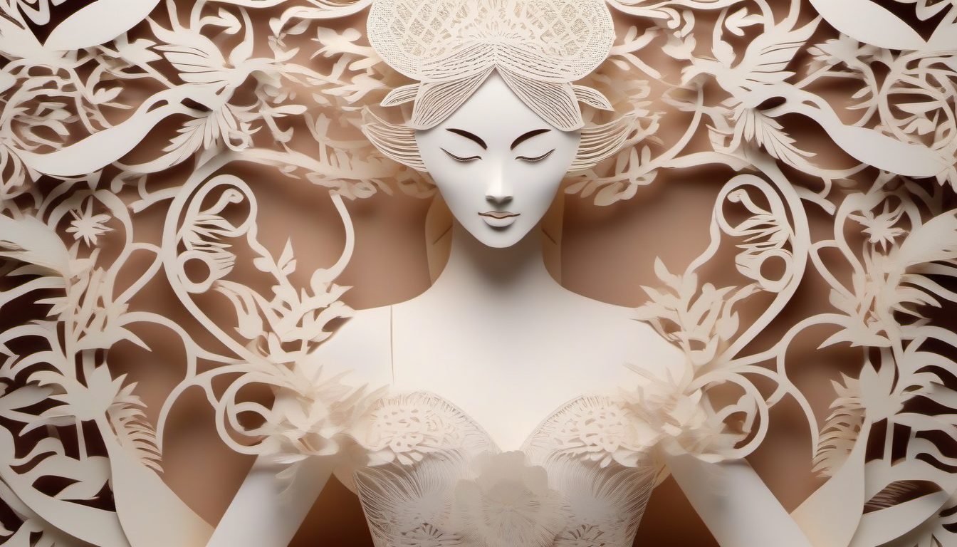 프롬프트: kirigami representation of {prompt} . 3D, paper folding, paper cutting, Japanese, intricate, symmetrical, precision, clean lines