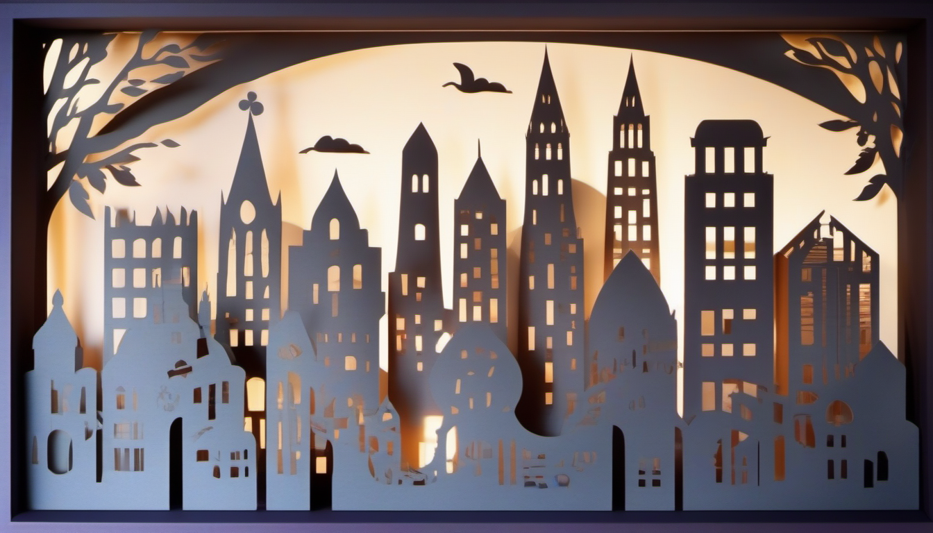 프롬프트: 3D papercut shadow box of {prompt} . layered, dimensional, depth, silhouette, shadow, papercut, handmade, high contrast