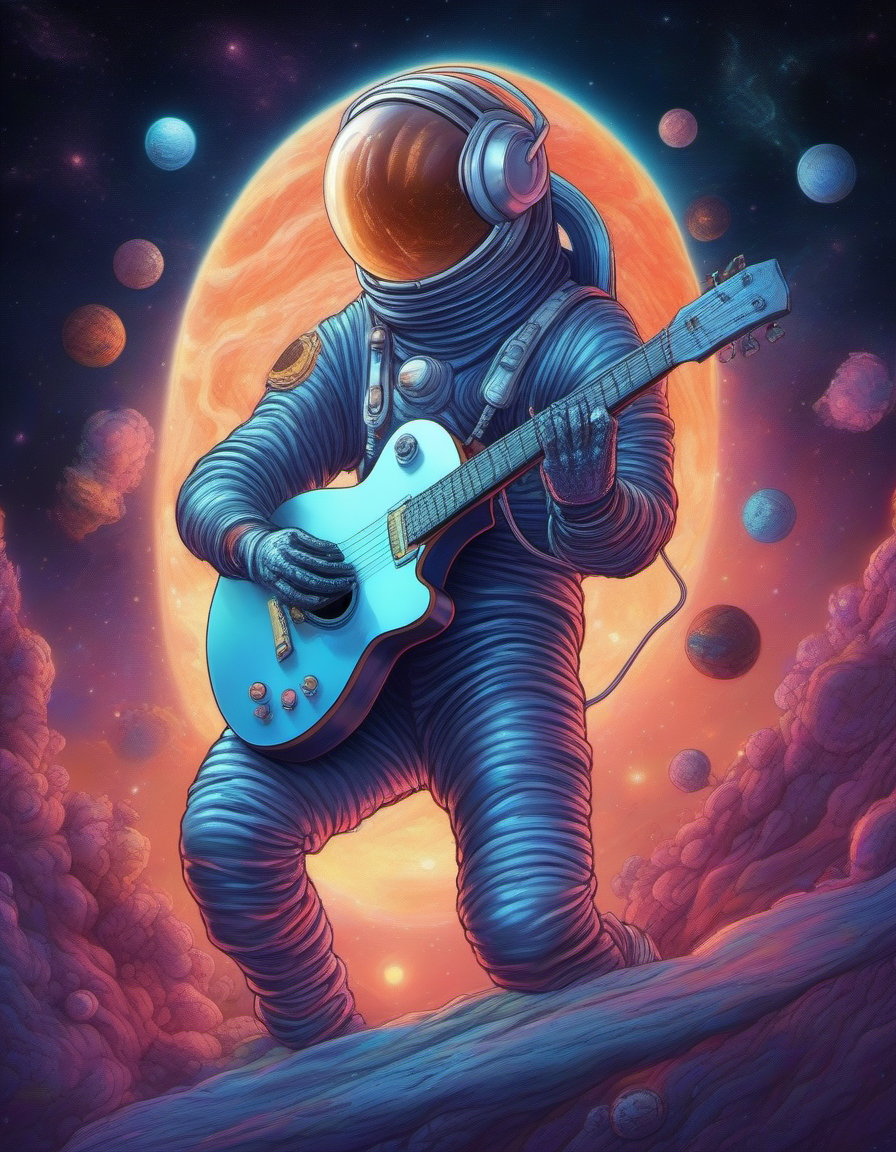 프롬프트: a man in a space suit playing a guitar, inspired by Cyril Rolando, shutterstock, highly detailed illustration, full color illustration, very detailed illustration, Dan Mumford and Alex Grey style