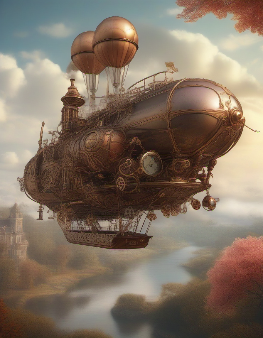 프롬프트: A steampunk-style airship soaring over a plain adorned with blooming flowers and sparse trees. The vessel's intricate design and vintage machinery evoke a sense of wonder and nostalgia. As it gracefully takes flight, billowing steam and gears in motion add to the mesmerizing spectacle of the airborne marvel. The scene portrays a unique blend of nature's beauty and the ingenuity of steampunk technology, creating a captivating and enchanting visual