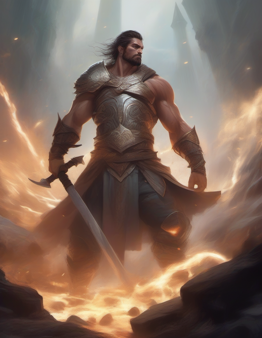 프롬프트: In a stunning artwork, a muscular warrior stands, wearing minimal armor, with an axe slung over his shoulder. He exudes a formidable presence, preparing for battle with a determined expression on his face. In the distance, epic combat unfolds as various wizards unleash powerful spells, filling the battlefield with mesmerizing bursts of magic. The illustration captures the essence of an intense and fantastical battle scene, where bravery and magic collide in a breathtaking display of action and heroism.