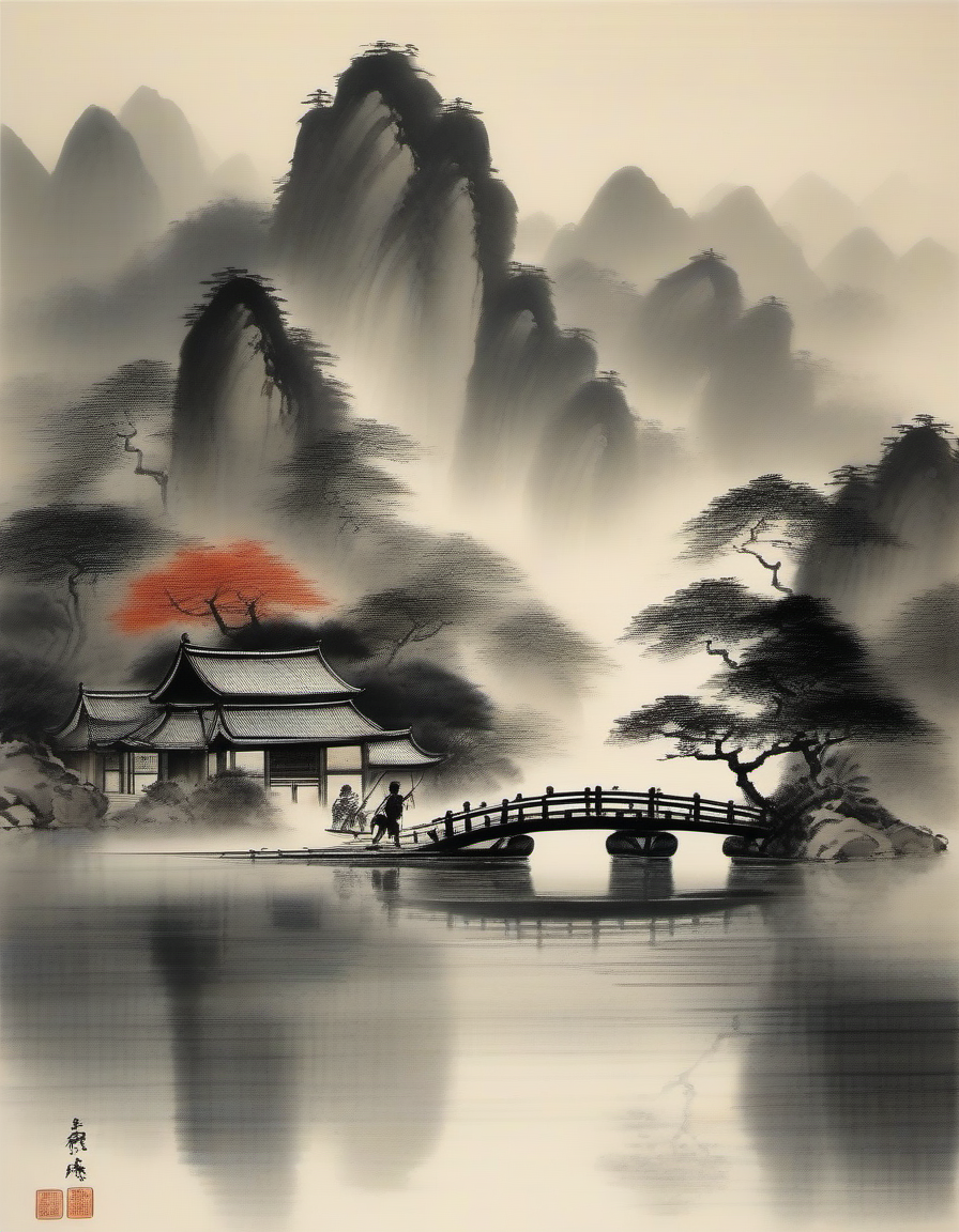 프롬프트: In a traditional Chinese ink wash painting, depicting mountains and a large lake, a scholar is seen crossing a bridge on his way to visit a small thatched cottage on an island in the lake. The serene scene captures the tranquility of nature and the scholar's contemplative journey, evoking a sense of peaceful harmony between man and the natural world.