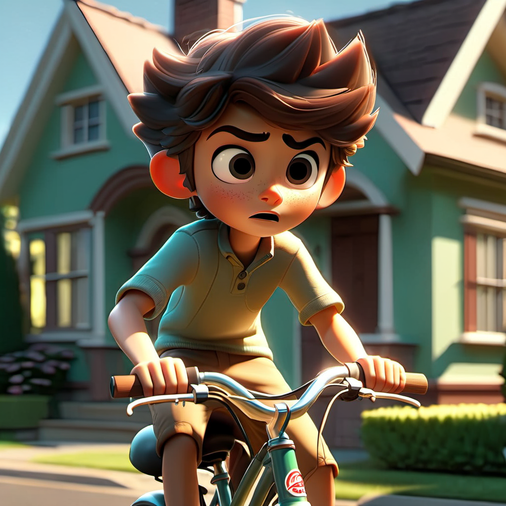 3D film, natural lighting, 4k, highly detailed, A boy riding bike very fast in neighbor, houses, lawn, mailbox