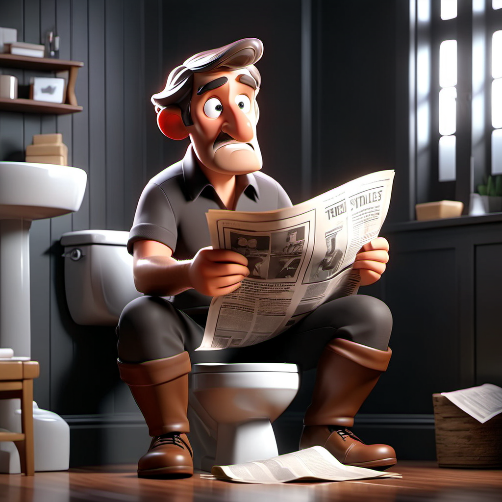 프롬프트 : 3D cinematic film, 4k, highly detailed, dramatic lighting, Middle aged man sitting on toilet and Reading Newspaper