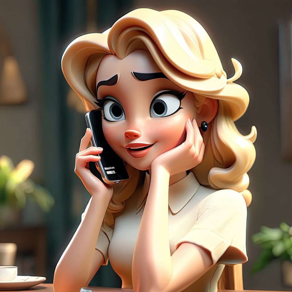 3D film, natural lighting, 4k, highly detailed, A sister on cell phone talking, blonde, happy