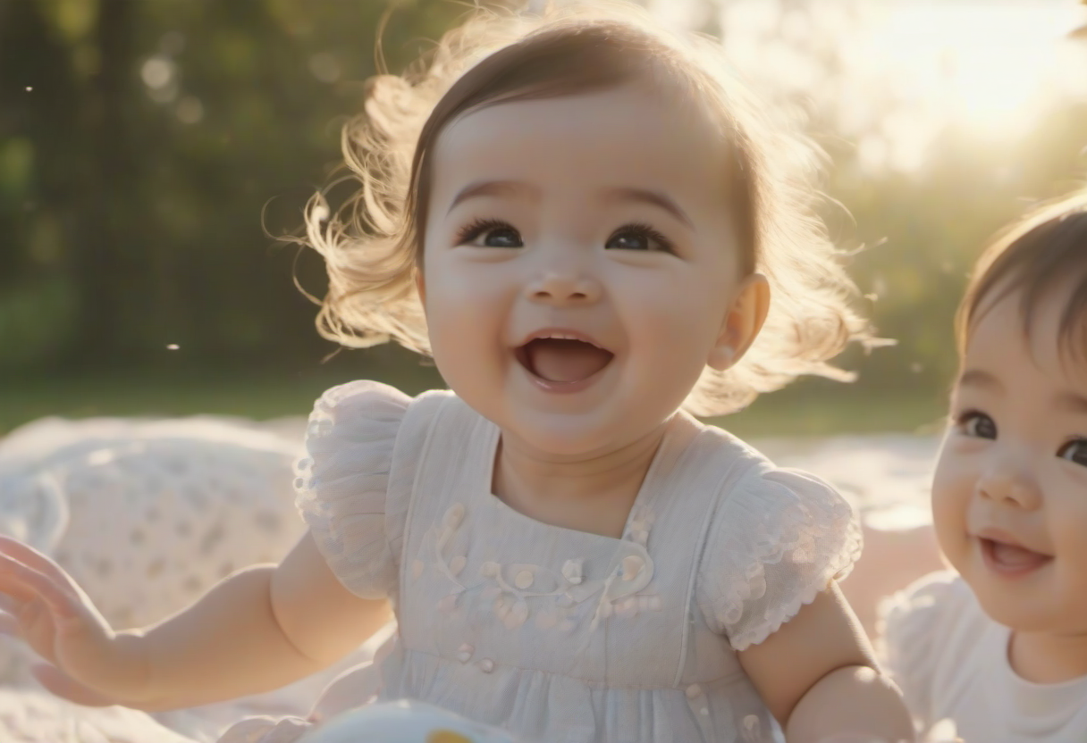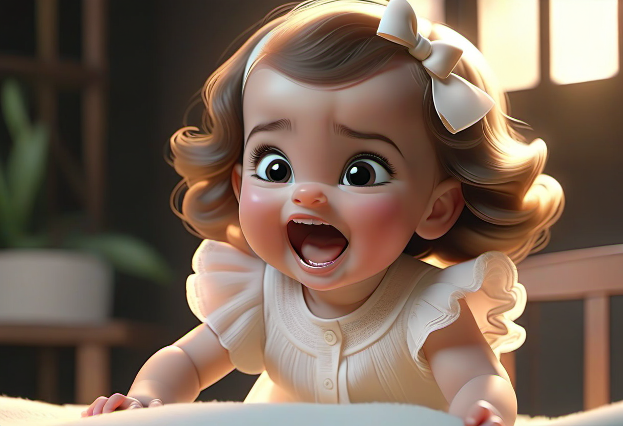 프롬프트: 3D film, natural lighting, 4k, highly detailed, A baby girl laughing very hard