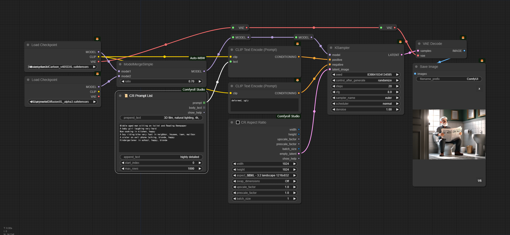 이 워크플로는 우선 2개의 모델을 실시간으로 합쳐주는 [ModelMergeSimple] 노드를 사용해서 이미지를 생성합니다. samaritan3d 모델의 경우 3D 캐릭터쪽으로는 매우 좋지만, 표정이 과하게 나오기 때문에 다른 모델(animateArtDiffusionXL)을 합쳐보았습니다. 0.8로 설정하면 samaritan3d가 80%, animateArtDiffusionXL이 20% 반영됩니다.