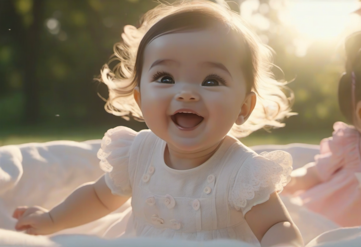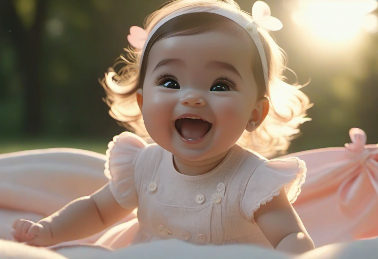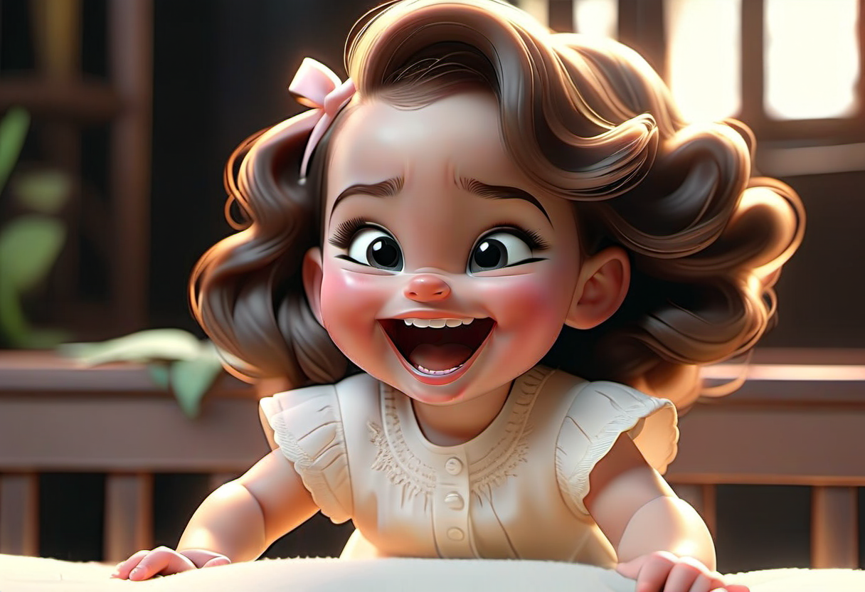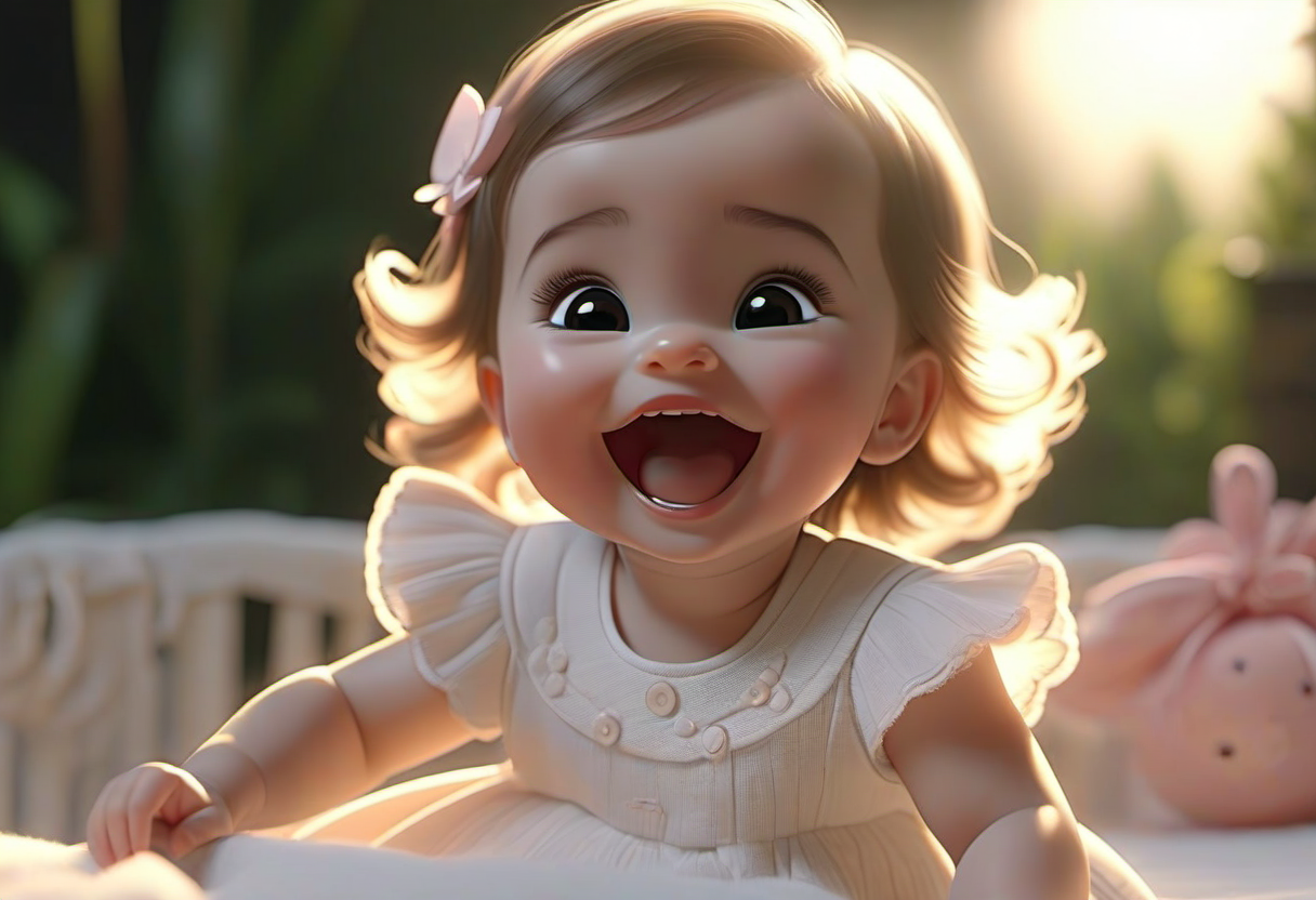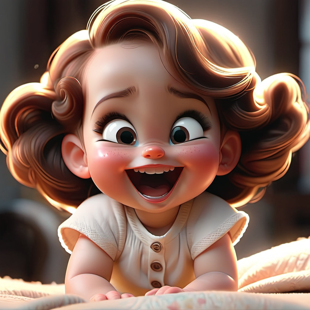 프롬프트: 3D film, natural lighting, 4k, highly detailed, A baby girl laughing very hard