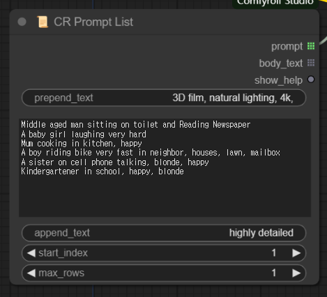 또한 프롬프트 텍스트를 아래와 같이 [CR Prompt List]를 사용해서 넣었습니다. 기본 설정은 start_index가 0, max_rows가 1000으로 설정되는데, 이렇게 설정하면 6개의 프롬프트에 대해 하나씩 이미지를 생성해줍니다. 2번째, 3번째 프롬프트만 이미지를 생성하고 싶다면 start_index는 1, max_rows는 2로 설정하면 됩니다.