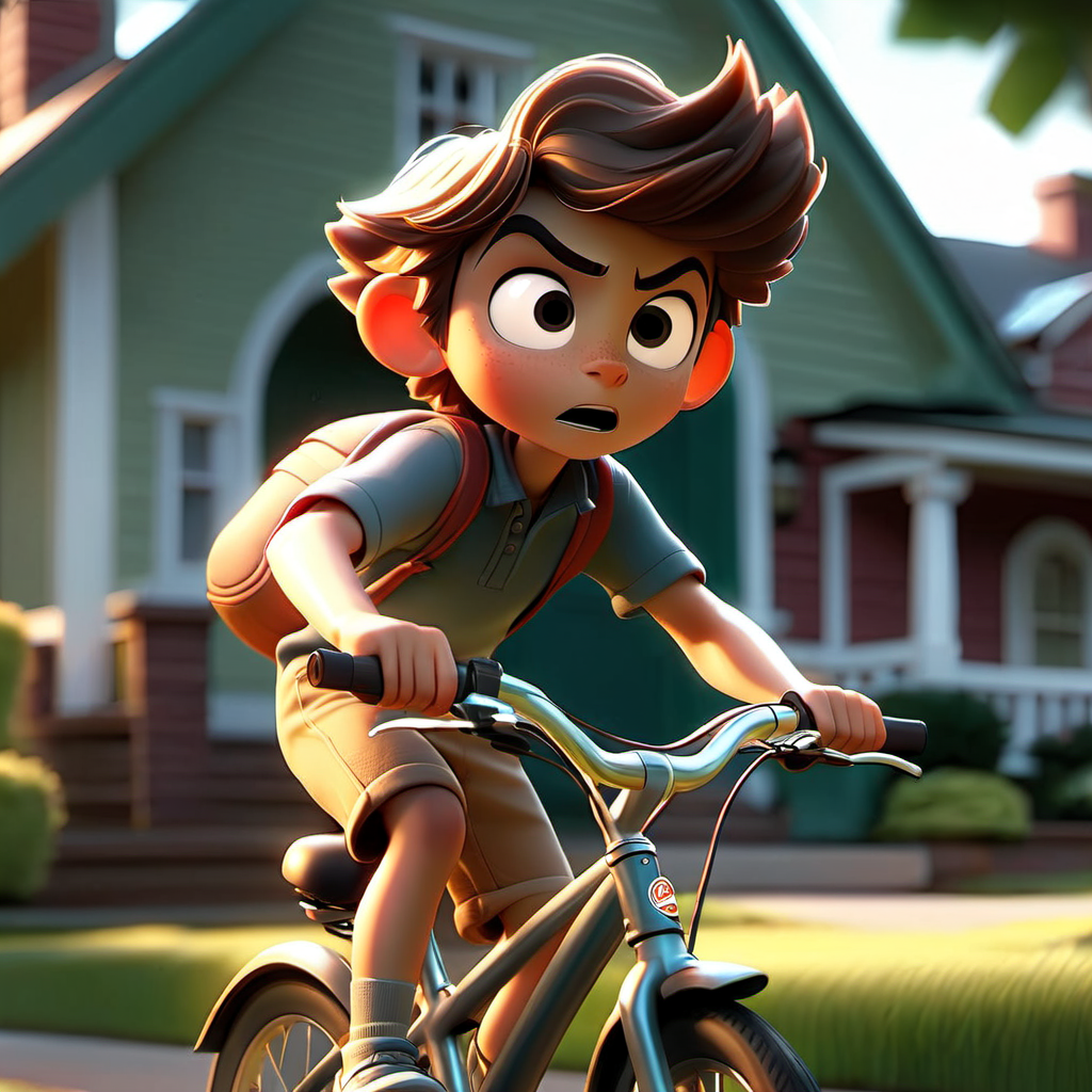 3D film, natural lighting, 4k, highly detailed, A boy riding bike very fast in neighbor, houses, lawn, mailbox