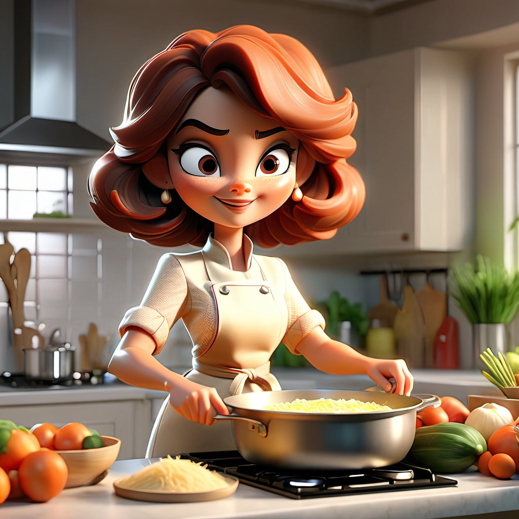 3D film, natural lighting, 4k, highly detailed, Mum cooking in kitchen, happy