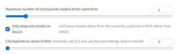 이렇게 변경해서 실행시켜보면, base 모델에서 refiner모델로 바꿀때 혹은 그 반대의 경우, 새로 모델을 불러들이는 것을 볼 수 있습니다. 이것을 방지하고 두 모델을 한번만 읽어들이도록 설정할 수 있습니다. Settings 페이지에서 [Stable Diffusion] 섹션에서 아래와 같이 설정해주면 됩니다. 그 바로 아래에 있는 "Only keep one model on device"가 기본으로 체크되어 있는데, 두개의 모델을 읽어들이더라도 VRAM에는 하나만 올라가도록 하고 나머지는 일반 RAM에 두도록 설정하는 옵션입니다. 메모리가 크지 않은 기계에서는 필수일 것 같네요.
