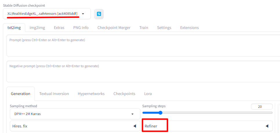 이번 업그레이드의 가장 중요한 점은 refiner를 보다 쉽게 사용할 수 있게 되었다는 것입니다. 예전에는 img2img로 들어가서 새로 모델을 불러들이고 세팅을 한 뒤에 실행해야 했었는데, 아래와 같이 Refiner 부분이 추가되어서 한꺼번에 실행할 수 있어 번거러움이 줄어 들었습니다.