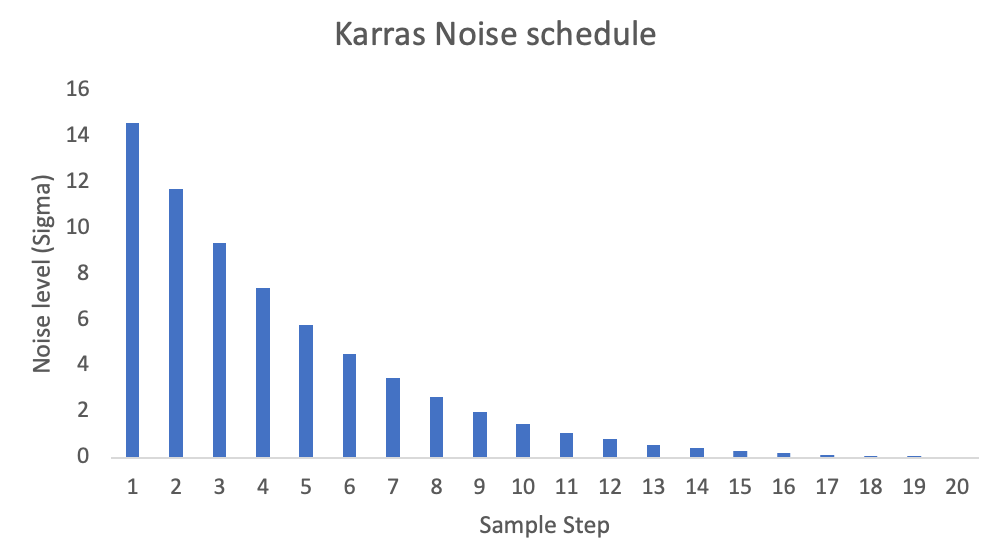 물론 잡음이 선형으로 줄어들도록 단계를 일정하게 나눌 수도 있습니다. 하지만 이렇게 하면 고품질의 이미지가 생성되지 않습니다. 그 대신 처음에는 단계 크기를 크게하고, 나중에는 작게하면 더 좋은 이미지를 얻을 수 있ㅅ브니다. 이래는 Karras 잡음 스케줄의 예로 이와 같은 방식을 따르고 있습니다.