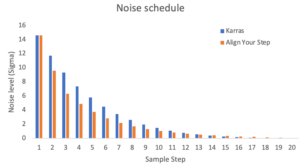 아래는 단계 정렬(Align Your Steps)와 Karras를 비교한 것입니다. 보시는 것처럼 단계정렬은 초기 잡음 단계 크기를 키우는 대신, 잡음 수준이 낮은 단계를 훨씬 많이 늘리고 있습니다.