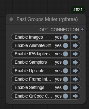[Fast group Muter} 노드를 사용하여, 일부분만 실행되도록 제어가 가능합니다. 예를 들어, 어떤 이미지를 사용할지 선택할 경우에는 아래와 같이 우선 AnimateDiff 그룹을 꺼버린 후 실행시키면 됩니다.