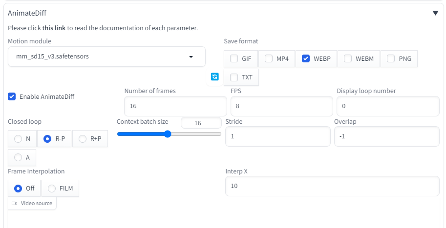 - "Motion module" 드롭다운에서 원하는 파일을 선택한다. Number of frames, closed loop 등 왼쪽