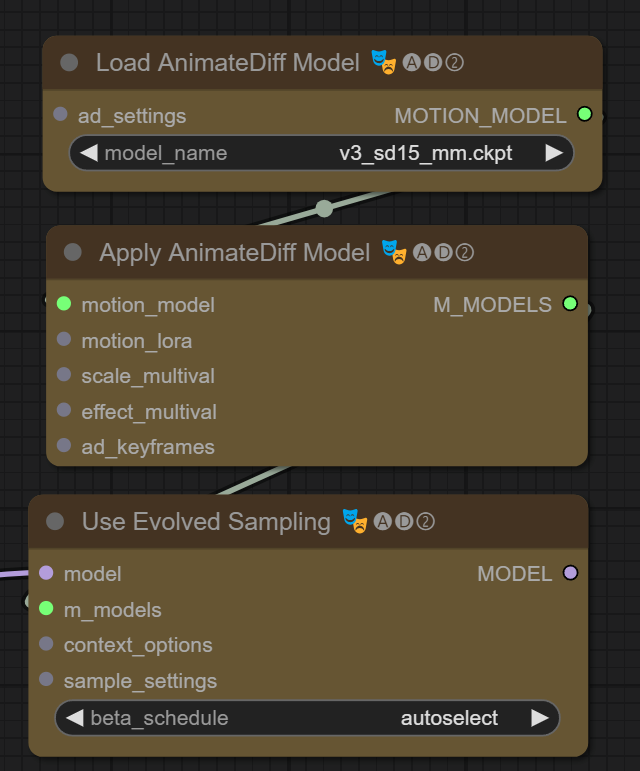 이 노드들은 애니메이션 길이를 연장하여 AnimateDiff 모델(대부분 16프레임)과 HotshotXL 모델(8 프레임)의 sweetspot 한계를 회피하는데 사용된다.