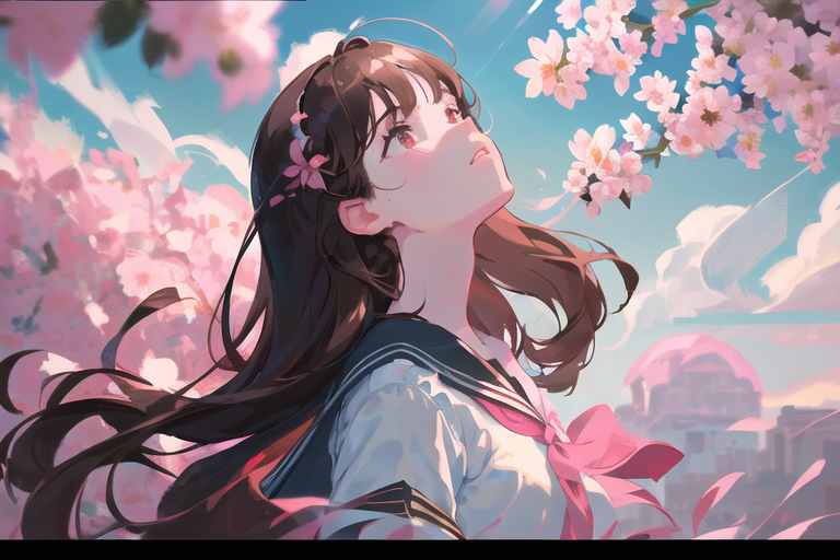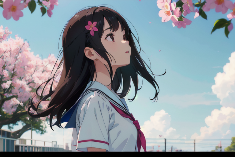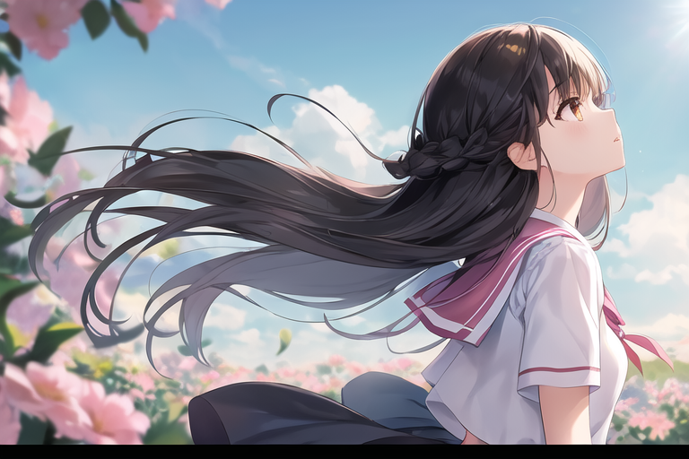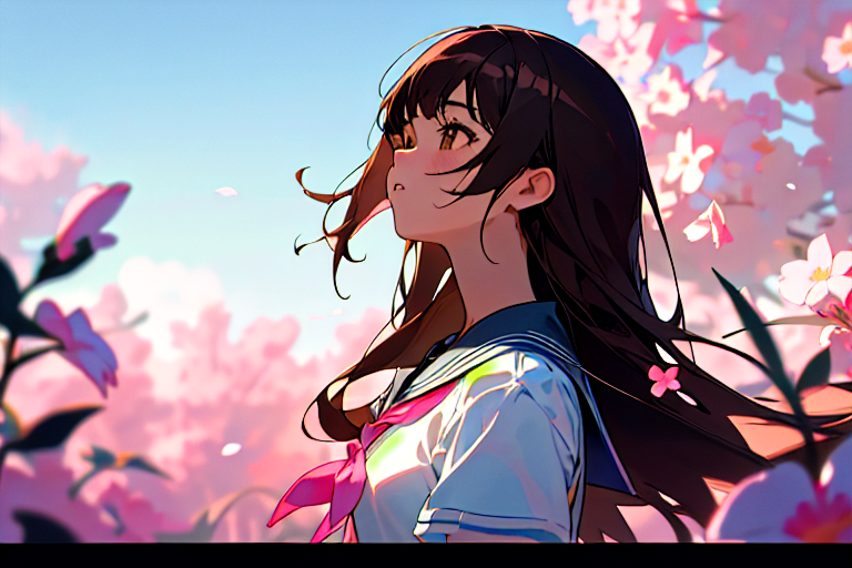 프롬프트: 1girl, solo, flower, long hair, outdoors, letterboxed, school uniform, day, sky, looking up, short sleeves, parted lips, shirt, cloud, black hair, sunlight, white shirt, serafuku, upper body, from side, pink flower, blurry, brown hair, blue sky, (masterpiece, best quality), depth of field