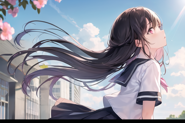 프롬프트: 1girl, solo, flower, long hair, outdoors, letterboxed, school uniform, day, sky, looking up, short sleeves, parted lips, shirt, cloud, black hair, sunlight, white shirt, serafuku, upper body, from side, pink flower, blurry, brown hair, blue sky, (masterpiece, best quality), depth of field