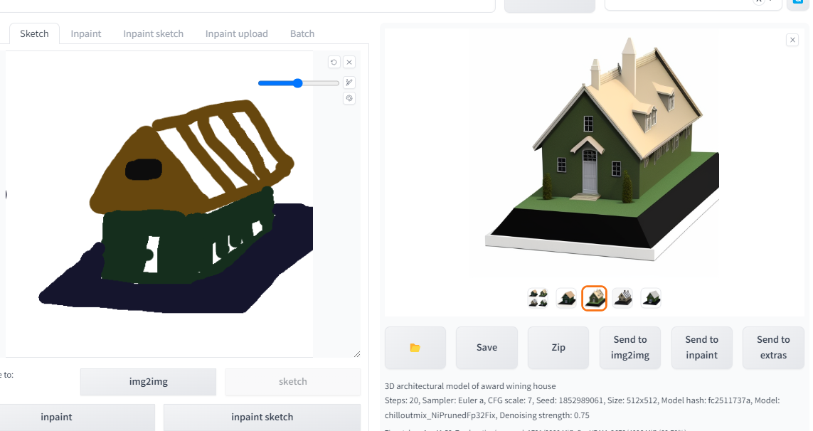 아래는 이러한 과정을 통해 그린 그림입니다. 왼쪽은 제가 대충 그린거, 오른쪽은 "3D architectural model of award wining house"라는 프롬프트를 지정해서 나온 결과물입니다. 생각한 거보다 훨씬 잘 나왔네요.ㅎ