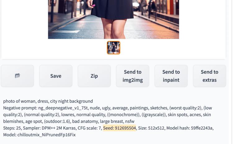 예를 들어, 프롬프트를 "photo of woman, dress, city night background"로 입력해 아래 왼쪽의 사진을 얻었는데, 이 사진에 팔찌를 추가하고 싶다고 하죠. 그러면, 사진를 클릭했을 때 아래에 나타나는 씨드 번호를 찾고, 그 번호를 씨드 번호에 복붙한 다음(씨드 번호 입력란의 오른쪽에 Recycle 버튼을 눌러도 됩니다.), 프롬프트에도 "photo of woman, dress, city night background, bracelet"이라고 추가를 해서 돌려주면 오른쪽의 사진을 얻을 수 있습니다. (물론 설정에 따라 완전히 다른 이미지가 나올 수도 있습니다)