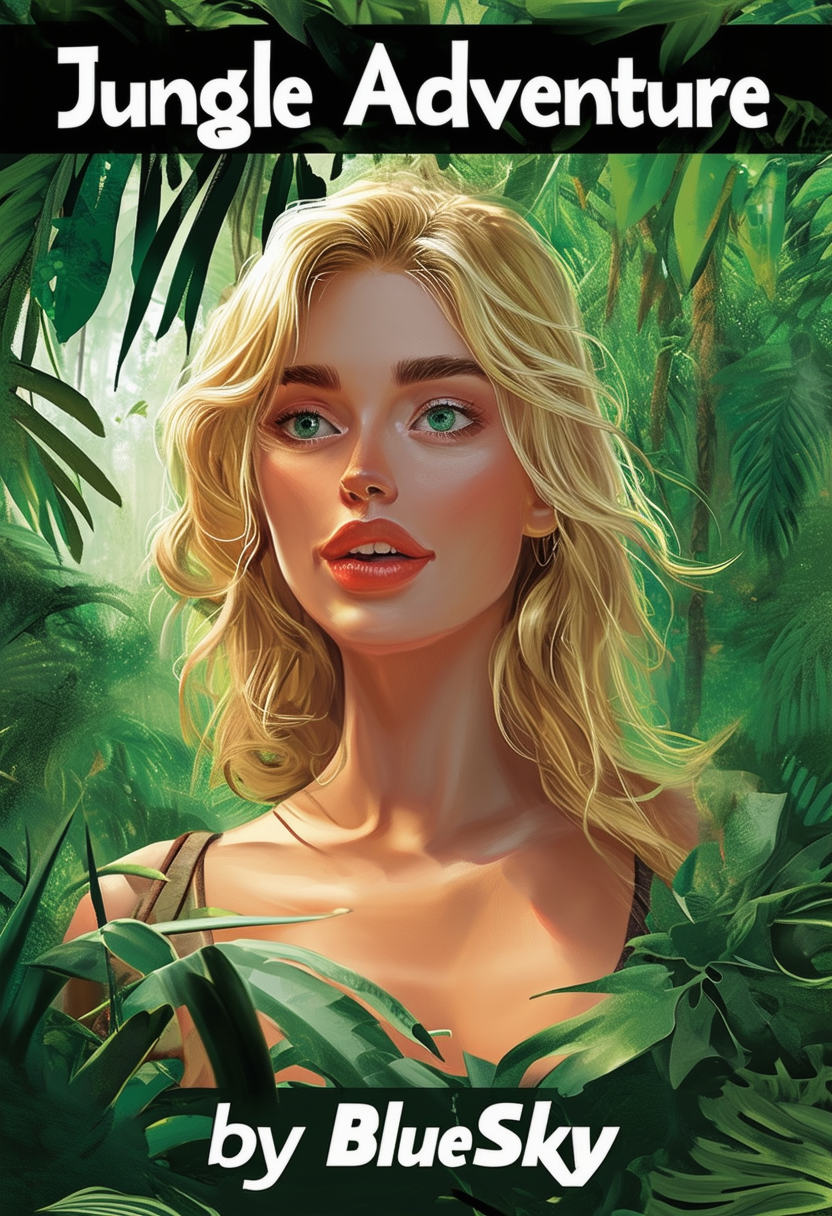 프롬프트: A book cover with title “Jungle Adventure” at top and “by BlueSky” at bottom, a realistic illustration of blond woman in jungle