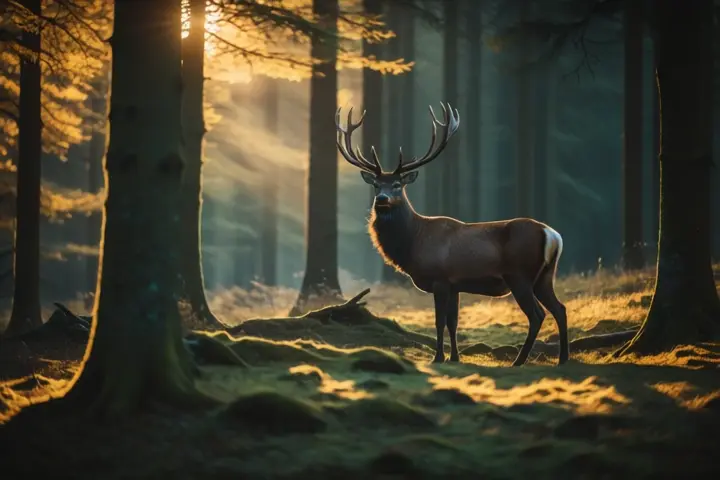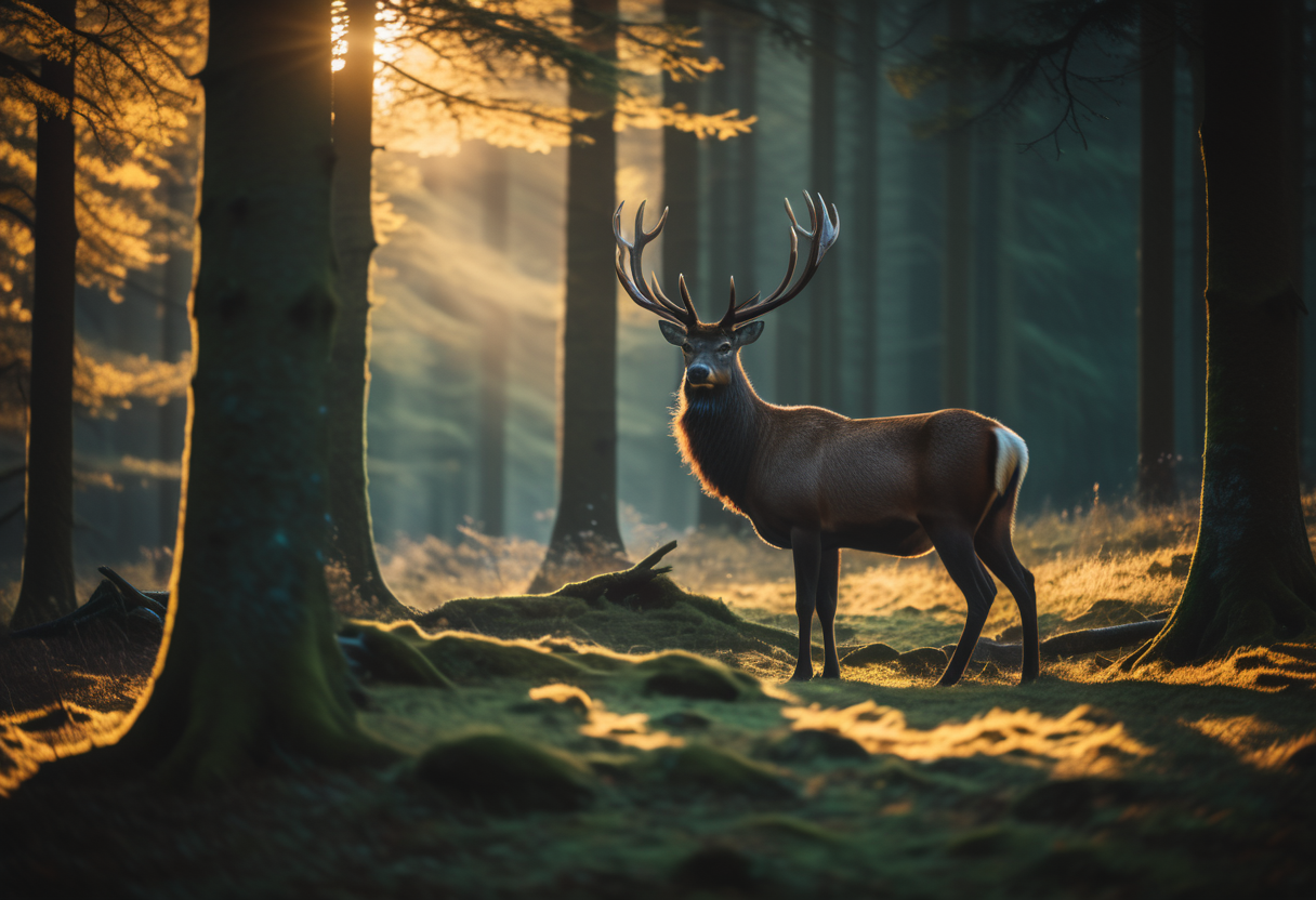 프롬프트: a majestic stag is grazing in an enhanced forest, basking in the setting sun filtered by the trees
