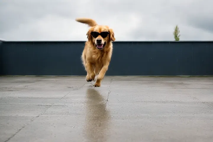 프롬프트: A golden retriever, sporting sleek black sunglasses, with its lengthy fur flowing in the breeze, sprints playfully across a rooftop terrace, recently refreshed by a light rain. The scene unfolds from a distance, the dog's energetic bounds growing larger as it approaches the camera, its tail wagging with unrestrained joy, while droplets of water glisten on the concrete behind it. The overcast sky provides a dramatic backdrop, emphasizing the vibrant golden coat of the canine as it dashes towards the viewer.