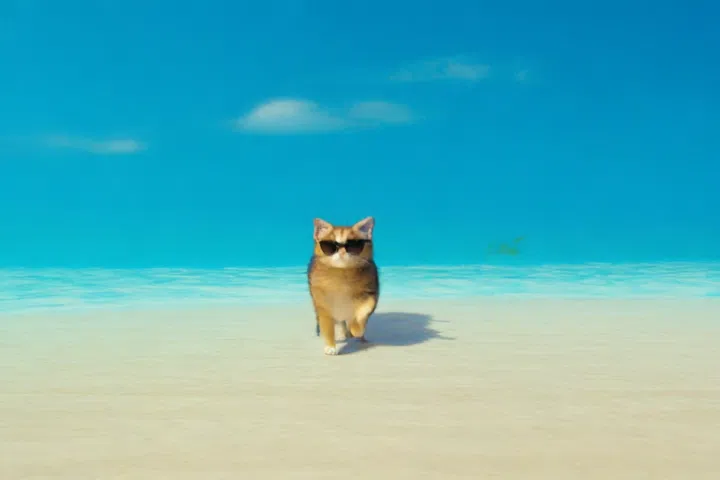 아래는 "A cat, sporting sleek black sunglasses, dashes towards the viewer, on a tropical island." 이란 프롬프트로 생성한 비됴입니다.