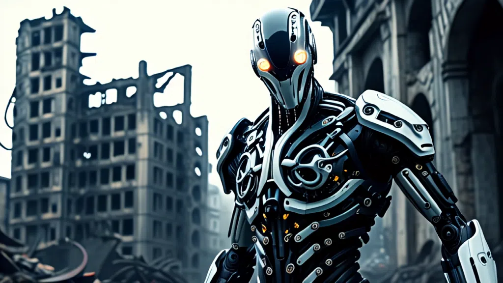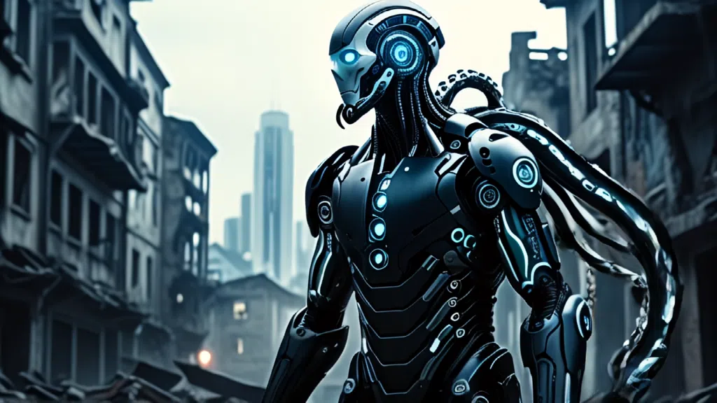 사이보그1: photo of a cyborg, half human, mechanical tentacles, city ruin background, dark movie theme