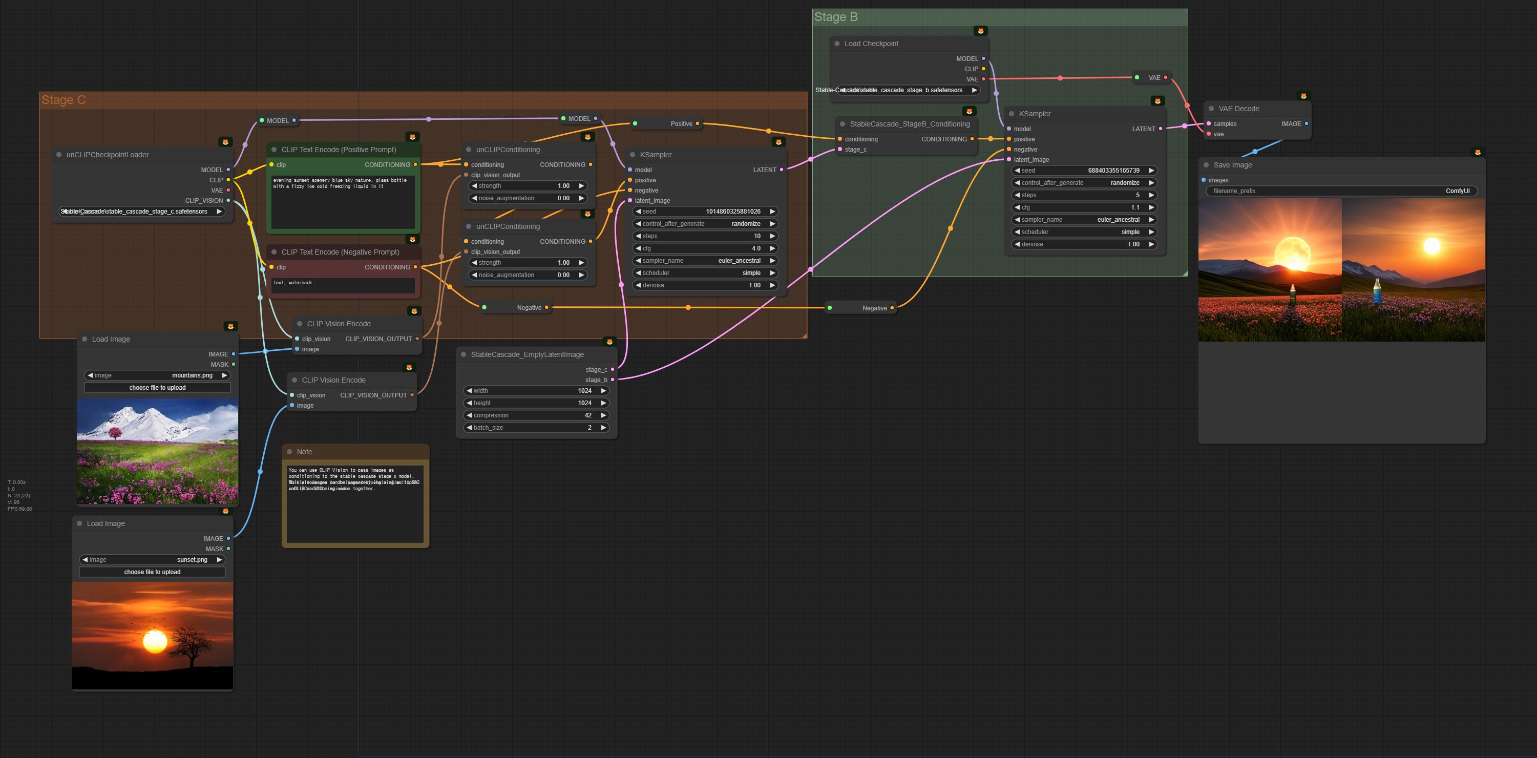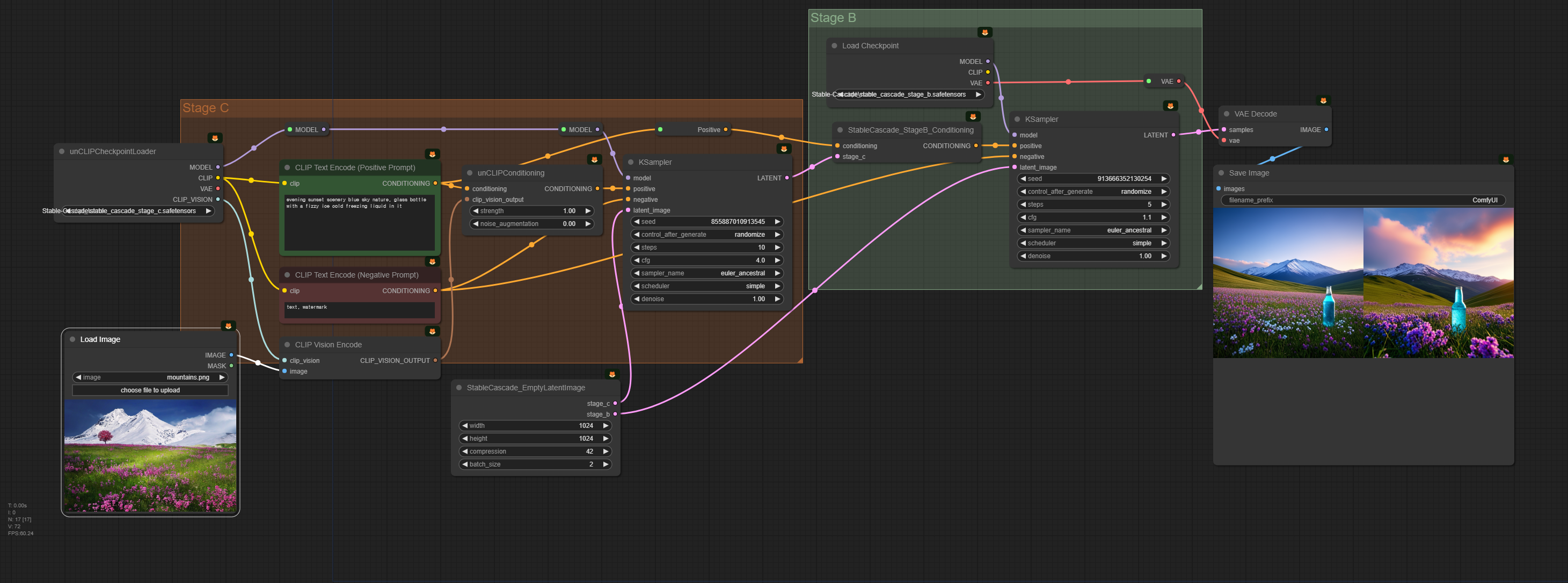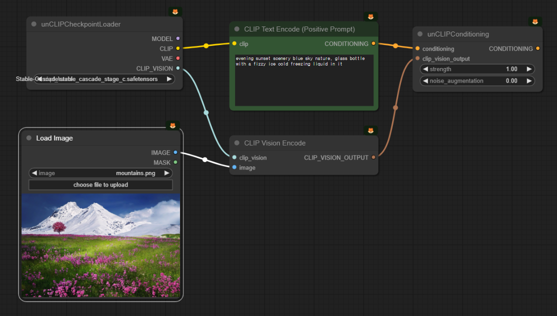 스테이블 캐스케이드는 입력된 이미지에 대한 CLIP vision 출력을 사용하여, 여러가지 변형된 이미지를 생성할 수 있다. 아래는 그 예제 워크플로입니다.