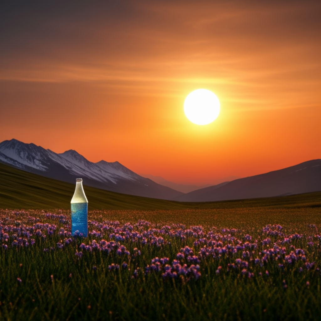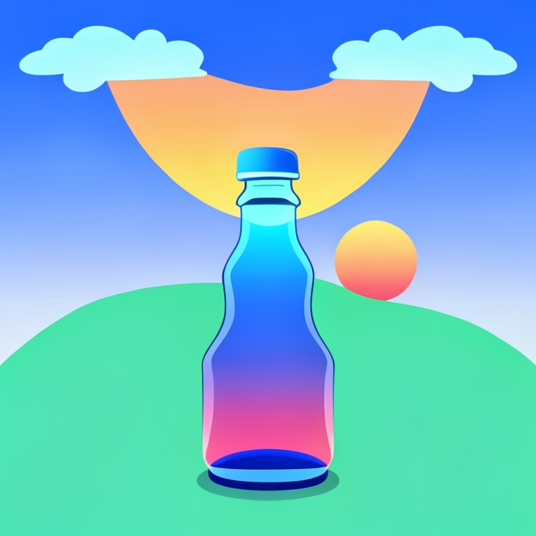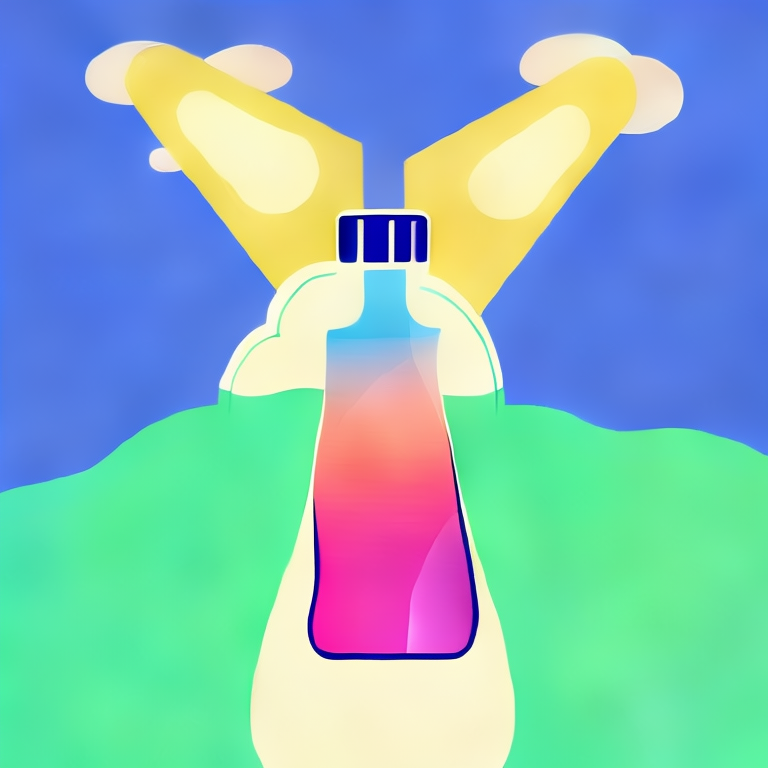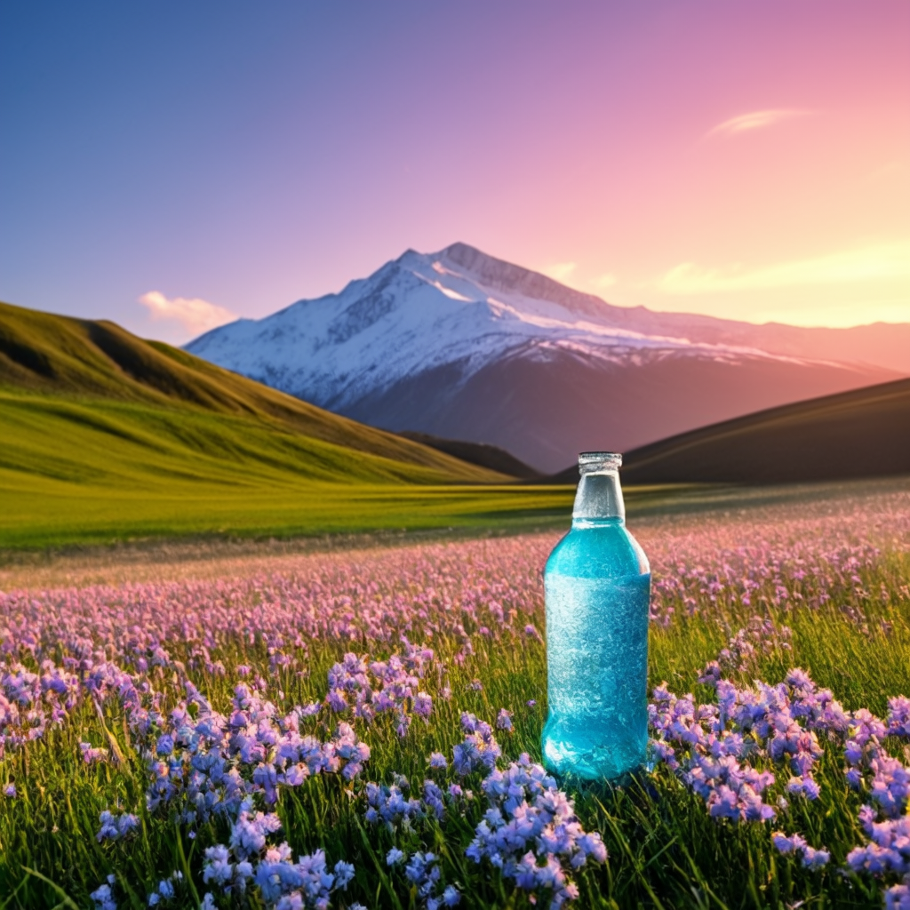 아래는 결과 이미지 입니다. 프롬프트는 "evening sunset scenery blue sky nature, glass bottle with a fizzy ice cold freezing rainbow liquid in it" 입니다.