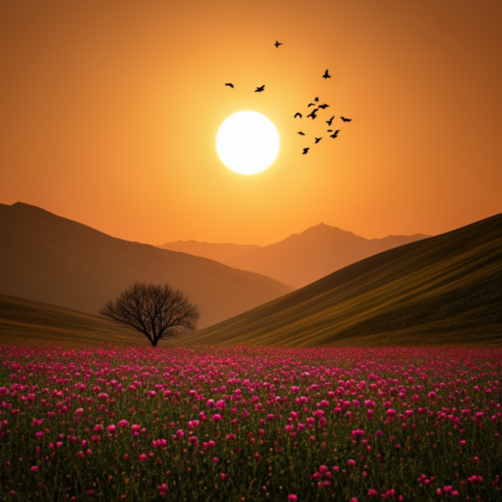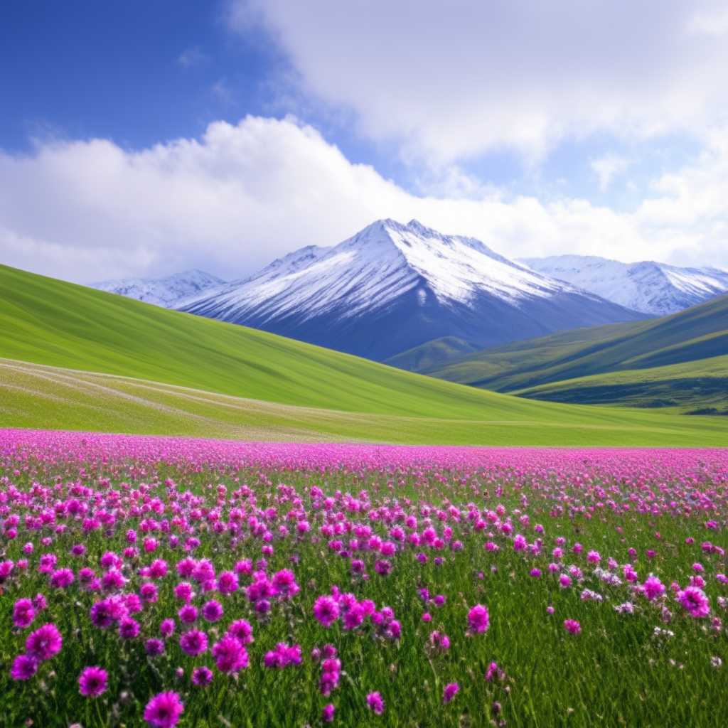 이 워크플로는 아얘 프롬프트 없이도 사용할 수 있습니다. 그러면 입력된 이미지와 전반적으로 분위기가 비슷한 이미지가 생성되죠. 아래는 그 결과입니다. 전경에는 분홍색 꽃밭, 배경에는 설산. 입력된 이미지와 상당히 비슷함을 알 수 있습니다.