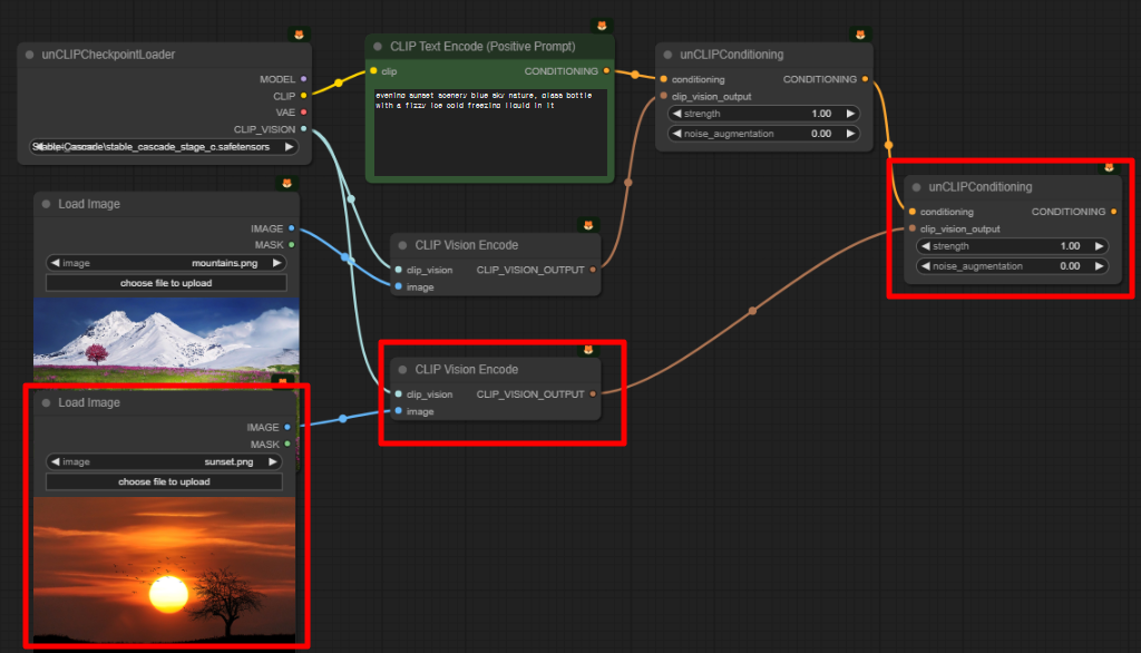 복잡해 보이지만, 바로 위의 "Image Variation" 워크플로와 거의 비슷합니다. 아래 보시는 것처럼, [Load Image], [CLIP Vision Encode], [unCLIPConditioning] 노드가 각각 2개가 있고, 이것이 뒤이어 연결되어 있을 뿐입니다. 여기에서 빨간색 박스를 칠해 둔 부분을 지워버린다면, 위의 "Image Variation" 워크플로와 완전히 동일해집니다. 그래서 별도의 설명은 하지 않겠습니다.