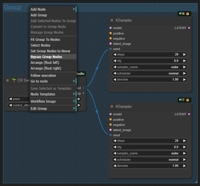 특히, 아래와 같이 같은 값을 여러개의 노드에서 사용할 때 유용합니다. 아래는 두개의 KSampler 노드가 동일한 씨드값을 사용하도록 구성한 예입니다.