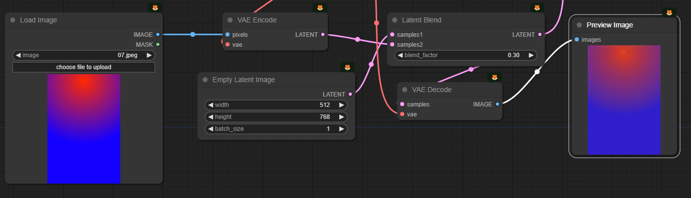위의 워크플로는 이를 보완하여 좀더 다채로운 색이 나타나도록 하기 위해 아래와 같이 입력된 이미지와, [Empty Latent Image]로 생성한 무작위 이미지를 [Latent Blend]노드로 합친 다음 이를 입력 이미지로 사용하였습니다(맨왼쪽과 맨 오른쪽은 겉보기엔 큰 차이가 없지만, 오른쪽엔 무작위 잡음이 섞여 있습니다)