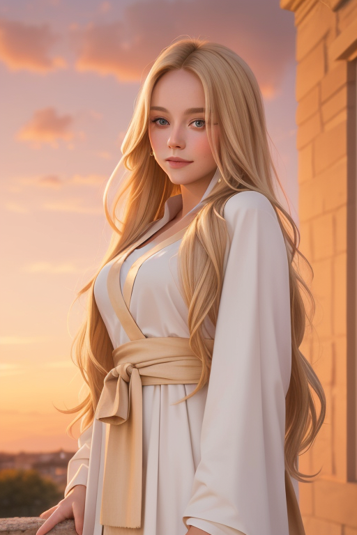 프롬프트: beautiuful female angel with long blond hair, with feathery white wings, wearing a red toga, city in the background ((masterpiece, best quality))