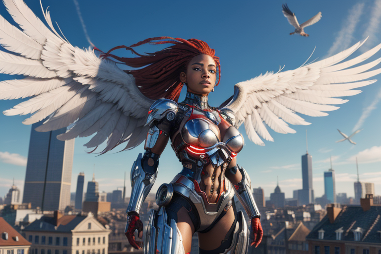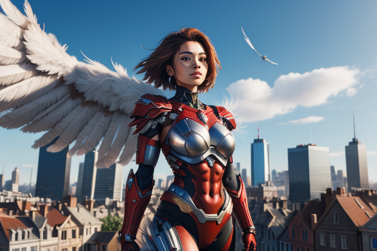프롬프트 : beautiful female cyborg with feathery wings and red armor, city in the background ((masterpiece, best quality))